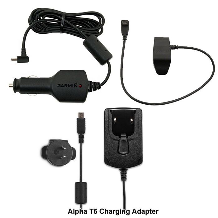Genuine Garmin Charging pack for Garmin T5 GPS dog tracking collar and TT15 Garmin GPS tracking and training collar. Package includes 1 x car charger, 1 x T5/TT15 collar charging clip and 1 x power Adapter.
