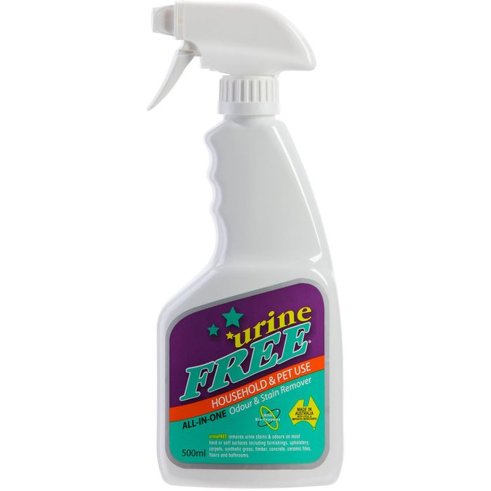 An all-in-one bio-enzymatic product in an easy to use spray bottle that will clean and remove all urine odours and urine stains whether dog urine, cat urine, other pet urine, human urine and household accidents. Works on carpets, fabric, wood floors, cement, tiles, porcelain, mattresses and most surfaces. How it works Urine (dog, cat or any animal) consists of urea, urochrome and uric acid crystals. Most general cleaners only remove the water soluble components of urine (urea and urochrome) but leave behind the non-soluble uric acid crystals that retain the urine stain and strong urine odour. These crystals attach to surfaces and are very difficult to dislodge. Any humidity or dampness will trigger the dormant crystals bringing back the urine smell. UrineFree's bio-enzymatic formula "eats up" the urine and uric acid crystals whilst removing the urea and urochrome components, eliminating both the urine stain AND the urine odour for good.