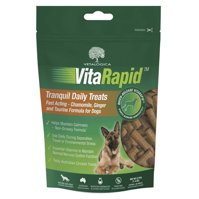 Quick-release VitaRapid Tranquil Daily Treats are expertly formulated with natural ingredients. These fast-acting, convenient, natural and delicious treats have been researched and developed by pharmacists, nutritionists and veterinarians. Used daily,VitaRapid provides essential vitamins and minerals to maintain calmness in dogs. Features: Fast acting assistance for the maintenance of emotional balance in dogs For use with dogs that exhibit fearful, anxious, aggressive or stress behaviours For use with dogs that are experiencing potentially stressful situations â« for example: veterinary visits, household changes, change in routine, separation, thunderstorms, fireworks, new pet and people introductions Specially formulated vitamins and minerals in correct ratios for dogs Quick release blend of Tryptophan and B Group vitamins in precise ratios, providing maintenance of emotional balance in dogs Essential vitamins to maintain normal nervous system function Natural ingredients in a ânon-drowsyâ chewable tablet Grain free Delicious chicken and duck flavoured tablet can be given as a treat to pups and adult dogs Australian made and owned Approximately: 28 treats per pack